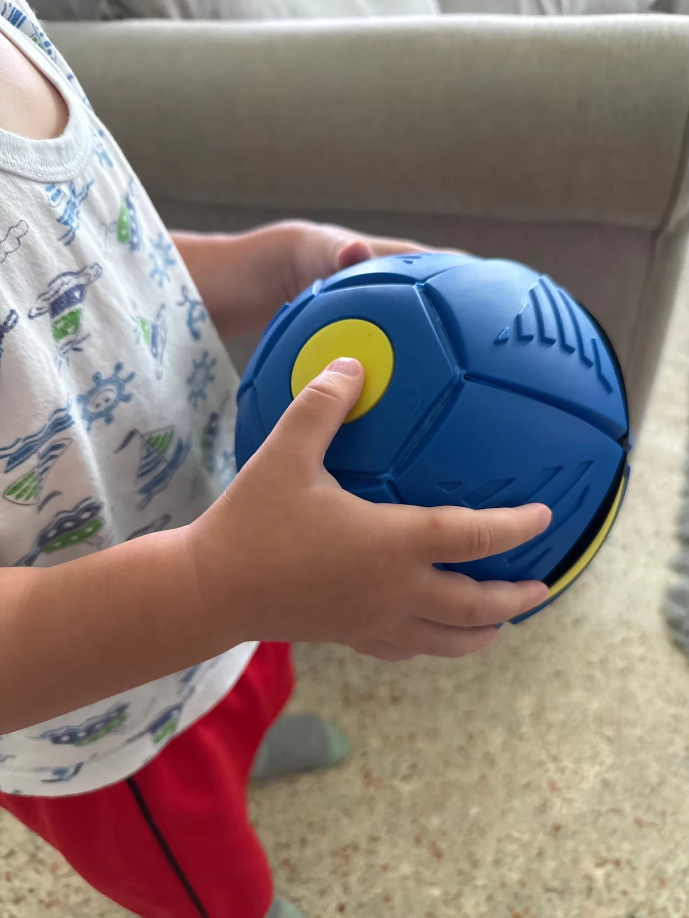 Soft rubber material is scratch resistant. Press the yellow circle in your palm and stick it up and down to become a frisbee.